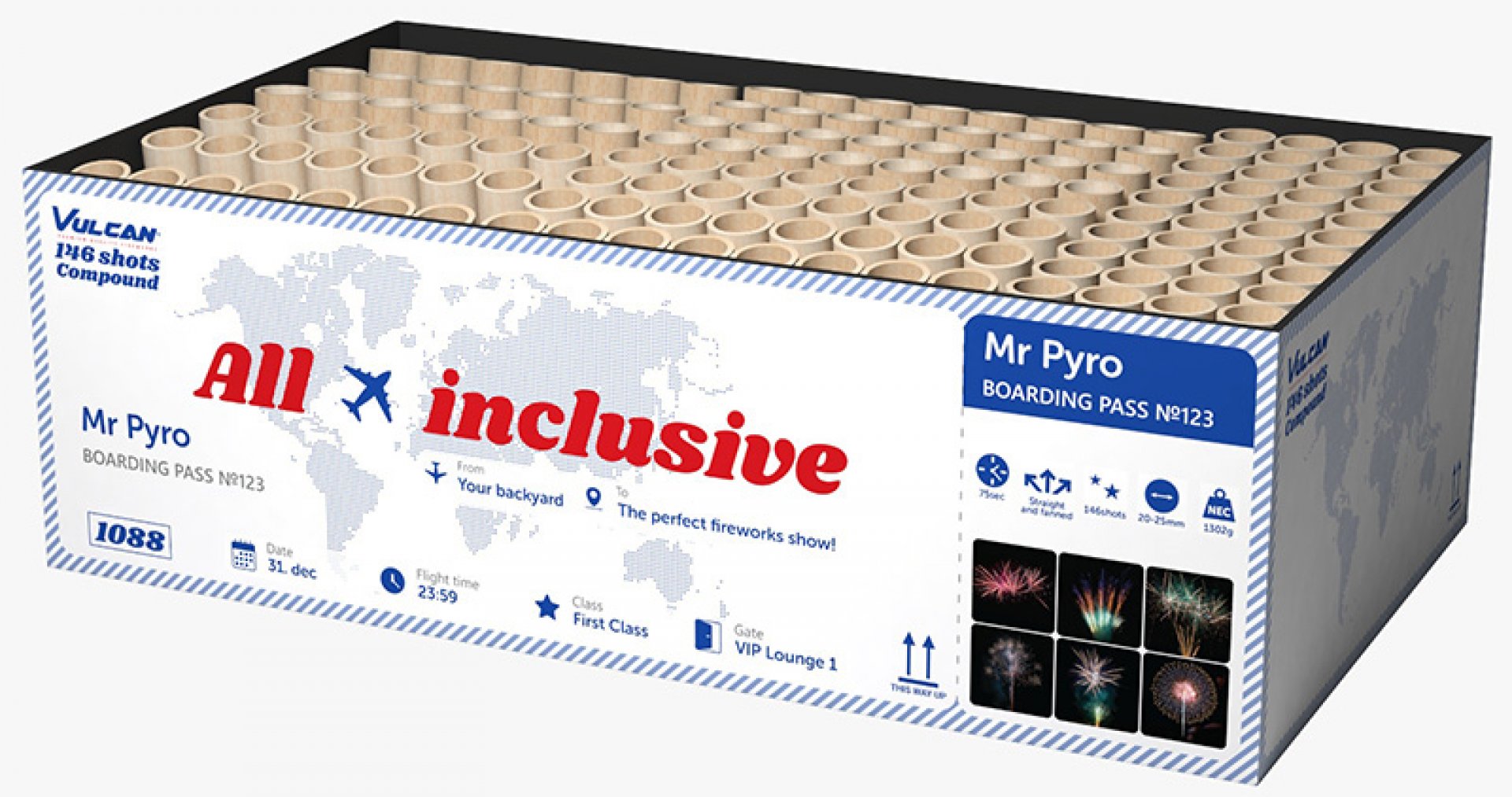 146 schoten puur, explosief genot! Ontketen het meest betoverende spektakel van de nachtelijke hemel met dit alles-in-één pakket, met een oogverblindende reeks kleuren, vormen en patronen die uw publiek zullen betoveren.